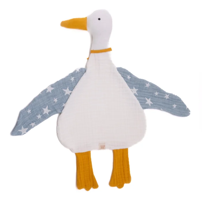 We are happy to introduce you to our favorite, handmade, 8 layered muslin duck lovey for babies and toddlers. It is so cute with its eyes and big beak on its face. We designed this goose with great happiness for your babies. Now we want to share this happiness with you.We have designed duck comforter with 8 layers muslin together to make it soft. We used high quality fiberfill stuffing for the duck's beak to ensure that they are nice and plump. We brought nature to your baby's room with this beautiful goose comforter.This security blanket is designed to be your little one's favorite toy, providing them with comfort and a sense of security. It envelops your baby in a cloud of comfort. This is the softest and loveliest blanket any baby could have. This is one of the baby essentials.The secret to our favorite goose toy's uniqueness? We use the softest muslin fabric since muslin is highly breathable, keeping your little one comfortable by providing warmth when needed and releasing excess heat when necessary. In addition you will be amazed with its lightness. You can take this goose toy everywhere with you since it needs less space. It is very comfy and cozy. This animal lovey is perfect as a gift for expecting mom and for baby shower. Personalize it with a name to make it an extra special gift. This fabric is OEKO-TEX Certified, so it's gentle on your baby's skin and eco-friendly (OEKO-TEX is a certification that ensures textiles are free from harmful chemicals).Fabric:- Back : 4 layers of 100% organic cotton muslin fabric- Front: 4 layers of 100% organic cotton muslin fabricStuffing:- Beak: Fiberfill stuffingDimension:Length : ≈19 inch (from head to the end of the foot)Width : ≈23 inch (including wings)Length of wing: ≈10 inchAll products are carefully packaged in specifically designed organic cotton bags for you. It is perfect for a gift.The actual color of the product may differ slightly due to the lighting sources in the photograph or your screen settings.We craft each item especially for you, so allow 1-3 business days for processing before it ships.