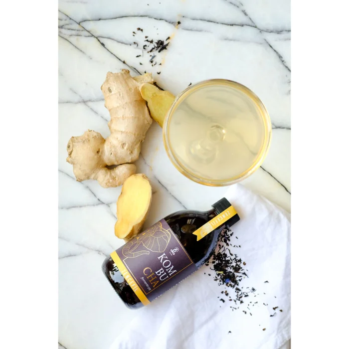 Kombucha Ginger Fermented Tea: Drinking Water, Sugar, Ginger (1%), Green Tea (0.27%), Black Tea (0.27%), Kombucha Culture. It does not contain additives, preservatives and colorants.