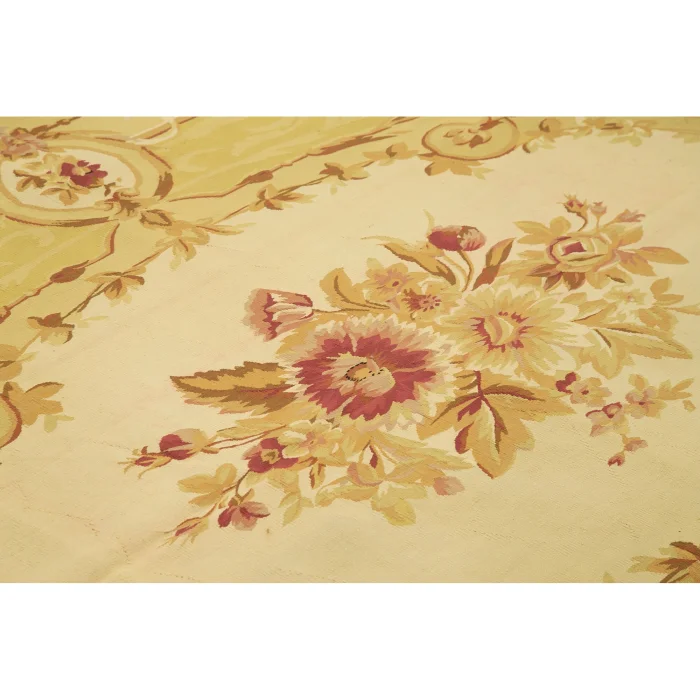 The Aubusson Rug is 265 cm wide by 366 cm long and approximately 5 mm thick. It weighs an average of 11 kg. It is made with hand-spun wool and cotton. It takes its colors from root dyes obtained naturally.