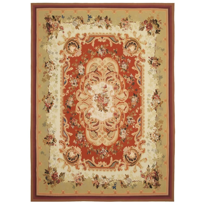 The Aubusson Kilim is 275 cm wide by 364 cm long and about 5 mm thick. It weighs an average of 12 kg. It is made with hand-spun wool and cotton. It takes its colors from root dyes obtained naturally.