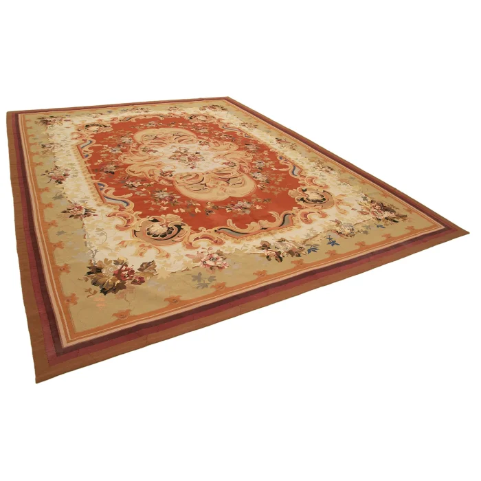 The Aubusson Rug is 312 cm wide by 407 cm long and about 5 mm thick. It weighs an average of 14 kg. It is made with hand-spun wool and cotton. It takes its colors from root dyes obtained naturally.