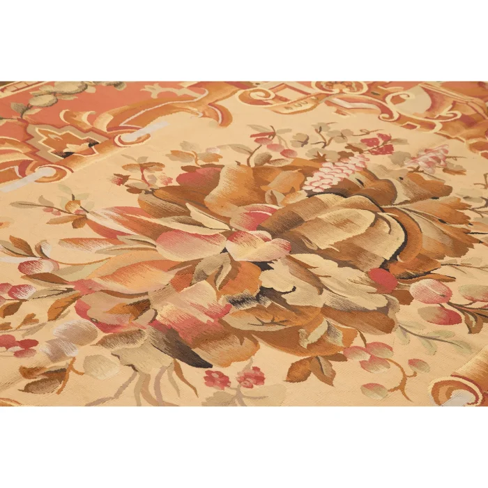 The Aubusson Rug is 303 cm wide by 331 cm long and about 5 mm thick. It weighs an average of 12 kg. It is made with hand-spun wool and cotton. It takes its colors from root dyes obtained naturally.