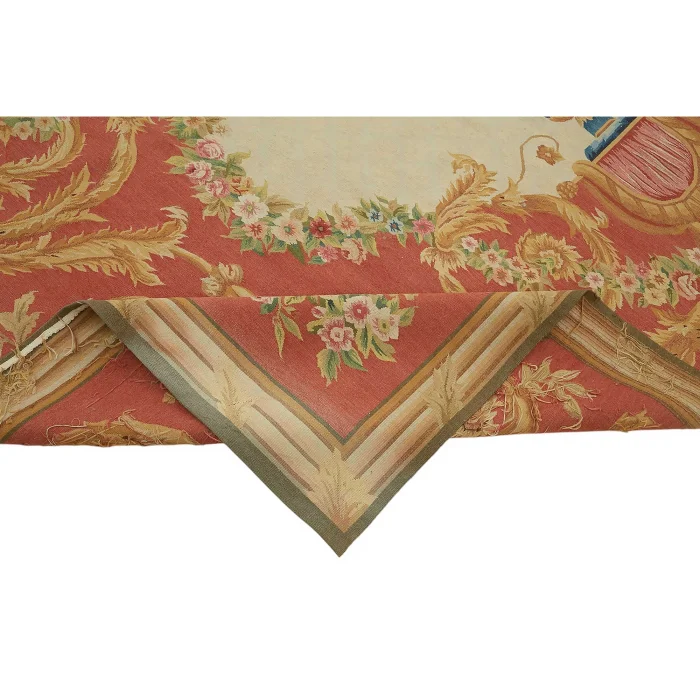 The Aubusson Kilim is 298 cm wide by 431 cm long and about 5 mm thick. It weighs an average of 14 kg. It is made with hand-spun wool and cotton. It takes its colors from root dyes obtained naturally.