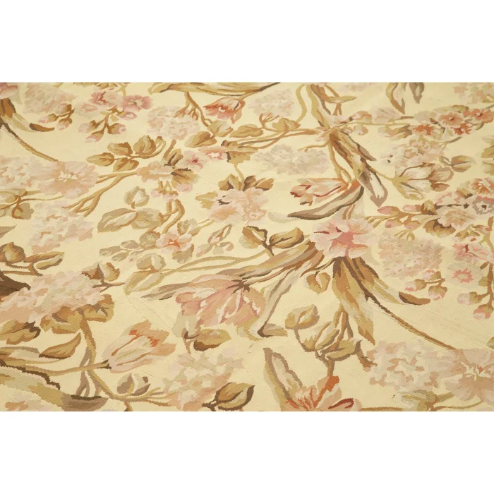 The Aubusson Rug is 268 cm wide by 368 cm long and about 5 mm thick. It weighs an average of 11 kg. It is made with hand-spun wool and cotton. It takes its colors from root dyes obtained naturally.
