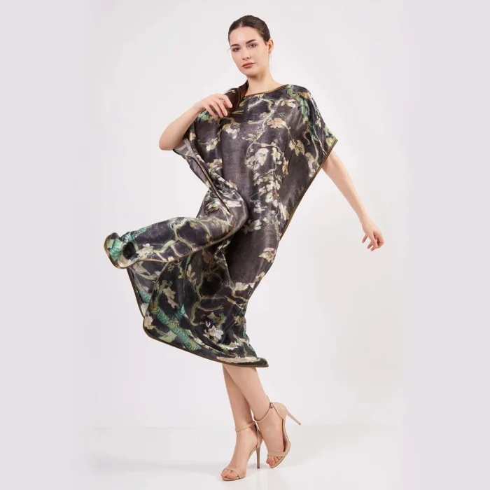 This special design, where elegance and art meet, was inspired by Van Gogh's peaceful "Almond Blossom". Made of natural and breathable 100% silk fabric, this long dress wraps the skin with its soft texture, does not sweat and provides comfort in all seasons. Almond blossoms embroidered on an anthracite background offer minimal romance and timeless elegance
