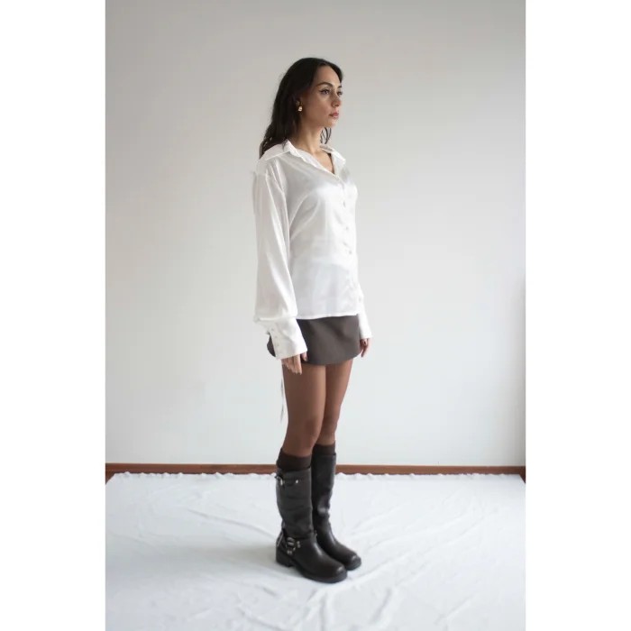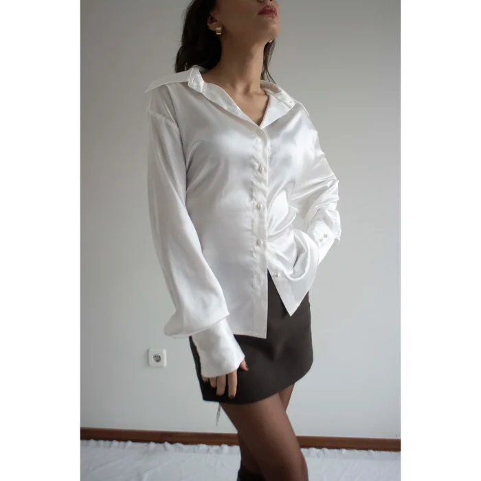 White satin shirt with long cuffs and elegant button detail. This shirt offers 3 types of use. The ropes at the back and the belts provide an oversized comfortable look when you do not fasten the belt, a fit look only when you tie the ropes, and a waist-fitting look when you fasten the belt.