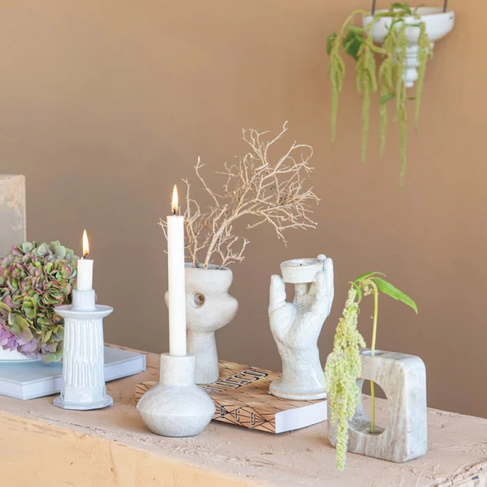 Interesting figures are spices that complement a room decor. The Porcelain Candle Holder can be added to a shelf, placed above a fireplace, or placed next to other objects. Sold Single.