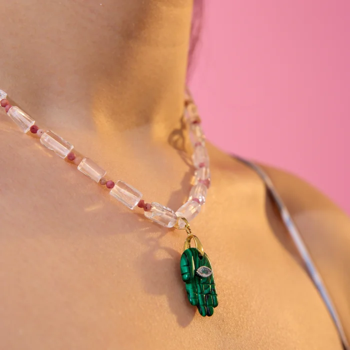 Product: Hamsa - Malachite, Rutile Quartz, Rhodonite Necklace