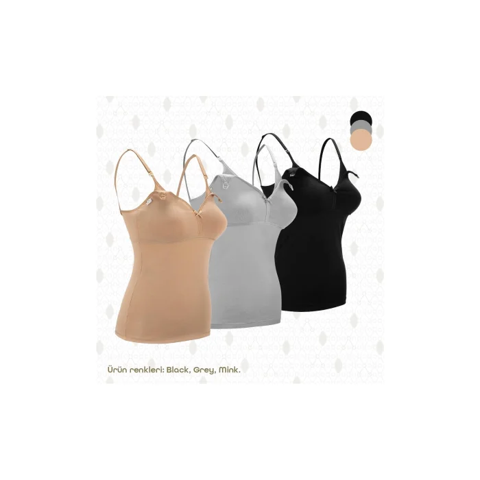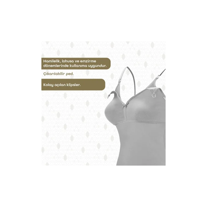 Product Description:Bmom Breastfeeding & Pregnancy Tank Top: The Choice of Stylish Moms! Do not compromise on your style while caring about your health and comfort. Maintain your elegance throughout your pregnancy with BMOM, designed with the unique signature of Gezenbebe. Standout Features:UNIQUE BROM SIGNATURE: This tank top offers more than just a Breastfeeding & Pregnancy Athlete; It is a fashion statement with Bmom's special pattern. BREATHABLE TEXTURE: With the unique softness offered by the breathable cotton fabric, your skin meets its most comfortable state. ULTRA-SOFT FABRIC: Specially designed for your comfort and enjoyment during pregnancy and postpartum period. EXCELLENT COMFORT: Ideal for home, outdoors, on the go, in public, or everyday use. UNIQUE DESIGN: Designed for you to breastfeed your baby comfortably and healthily. LONG-TERM USE: It is suitable for use during pregnancy, postpartum and breastfeeding. EASY TO USE: Thanks to the easy-to-open clips, you can breastfeed your baby without taking off your underwear. Technical Specifications:Sizes: 80B, 85B, 90B, 95B, 100BRenks: Grey, Black, MinkFabric: 93% cotton, 7% lycraBmom is with you in the most special moments of motherhood. With its stylish and functional design, we have prepared it with the comfort of you and your baby in mind. Feel comfortable and stylish anytime, anywhere with Bmom!