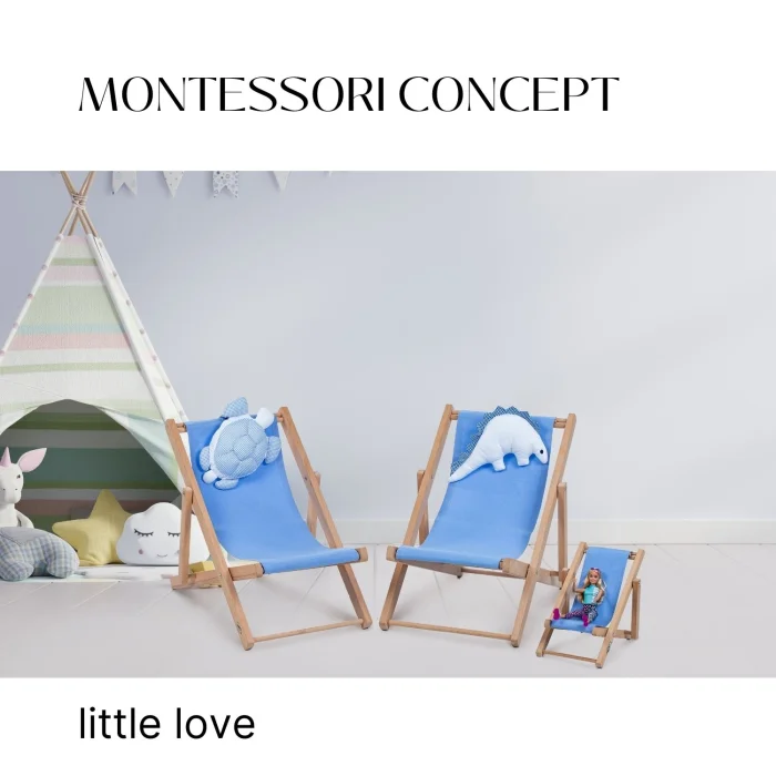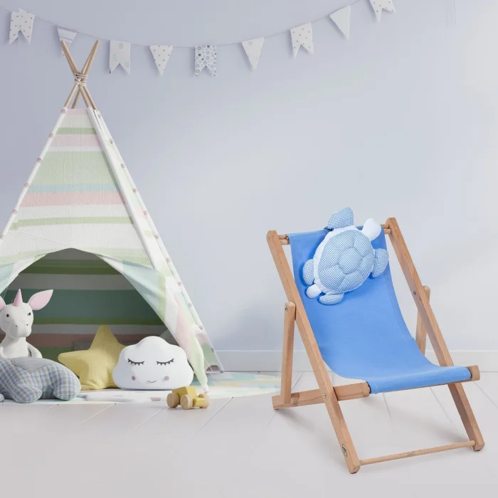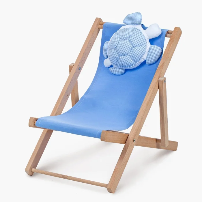 Two-stage solid wood fun natural children's resting chair. Champion Caretta Caretta pillows, toys and cushions are included.