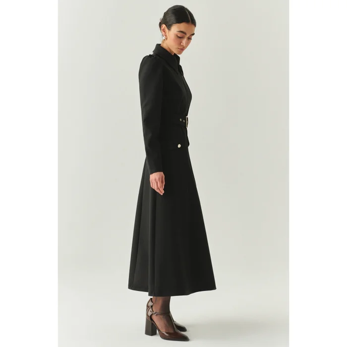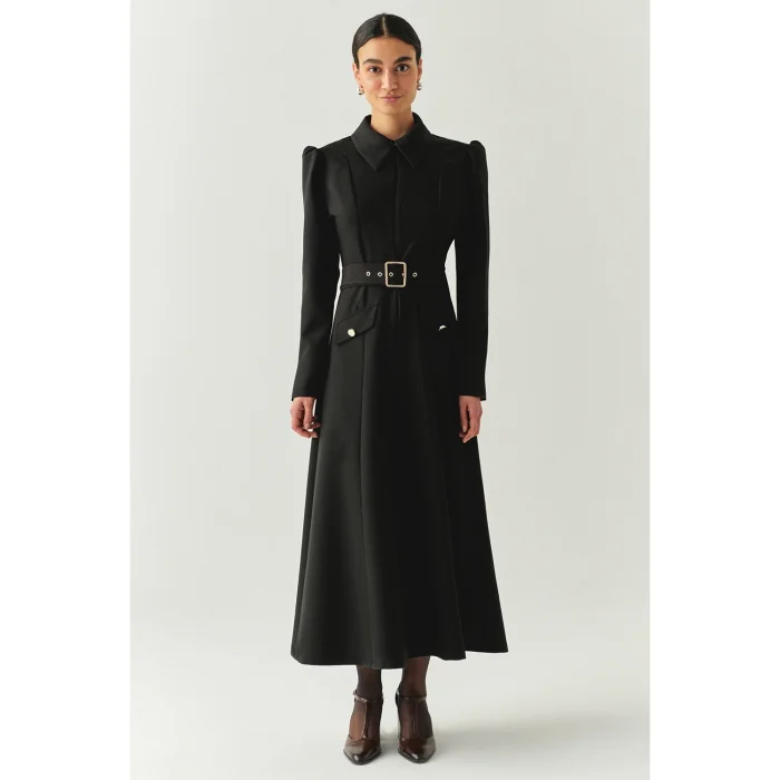 Product: Front Zippered Belted Long Sleeve Slim Fit Midi Dress