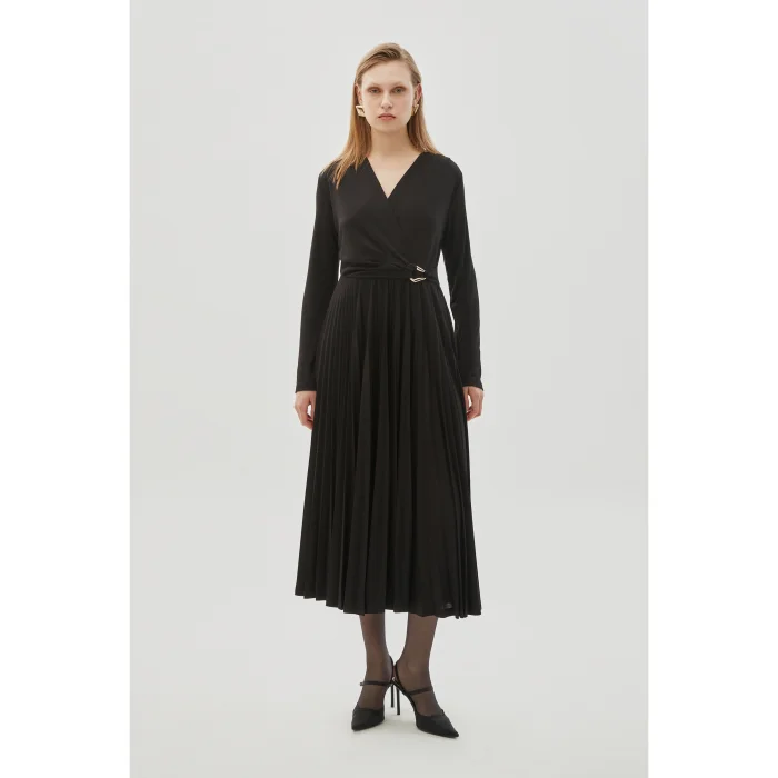 Offering elegance with its midi length and pleated details, this black knitted dress provides a comfortable and flexible fit thanks to its lycra fabric. Its regular cut creates a stylish option that can be easily used in both daily and special invitations.