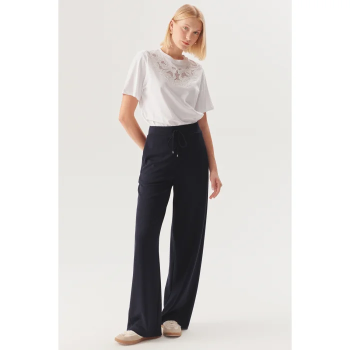 Navy blue knitted trousers with lace details, which offer comfort and elegance together, will be indispensable for daily combinations. These trousers, which provide freedom of movement with their soft and flexible texture, offer a modern look with their wide-leg design. It provides a comfortable use thanks to its elastic waist and lace detail. You can create a casual style with sneakers or highlight your elegance with heels.