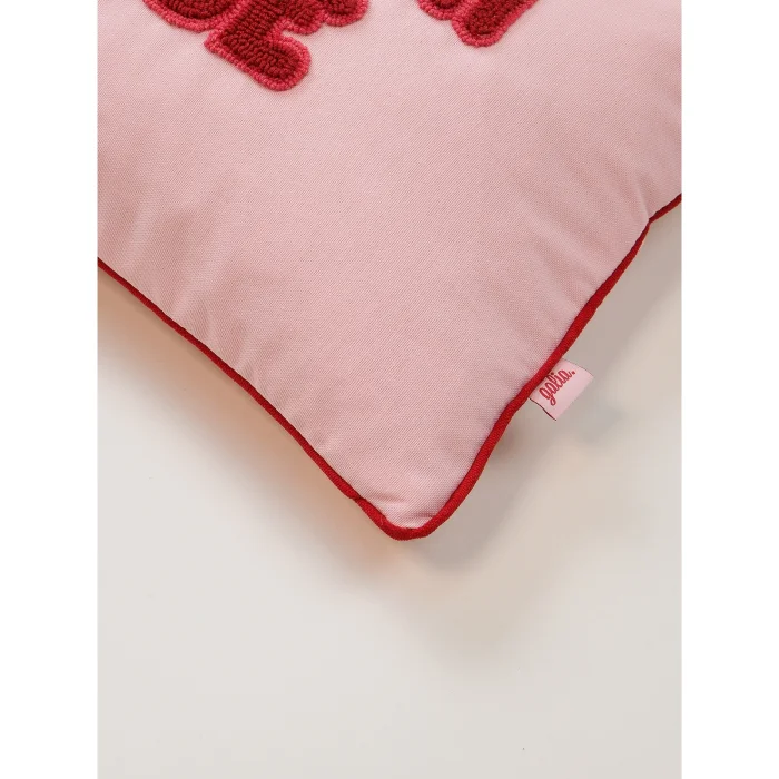 The red lettering rendered using the punch needle technique creates a strong visual impact against the soft pink background. Thanks to its color harmony, it adds character especially to young people's rooms, office corners or relaxation areas. The red piping that wraps around the edges completes the elegance.