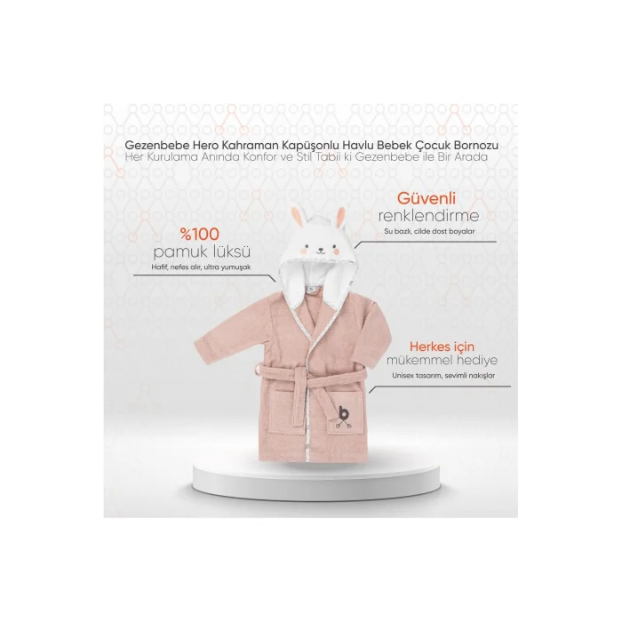 Product DescriptionGezenbebe Hero Hero Hooded Towel Baby Children's Bornose: Warm hug for little heroes! Gezenbebe Hero Hero Hooded Towel Baby Children's Bornose keeps your little heroes warm by embracing them. This bathrobe, which has a stylish and gentle design with pastel tones, is home to the facial embroidery of Gezenbebe's cute heroes, Elephant, Rabbit, Teddy Bear and Koala, and their cute ears. The hood in the form of a cap, which is easily put on your baby's head, allows it to dry quickly after bathing. With its iconic Gezenbebe patterned piping, this robe adds both comfort and style to your baby. Make the post-bath moments warm and fun with the Gezenbebe Hero Bathrobe! Prominent Features: GEZENBEBE SIGNATURE: With the beloved heroes of Gezenbebe, the little ones do not compromise on their elegance after bathing. SUPERIOR QUALITY: The breathable cotton fabric gently hugs babies' skin and is suitable for long-term use with its durability. COMFORTABLE AND WARM: With its cute patterns and soft texture, it makes post-bath moments more enjoyable. SAFE FOR BABIES: Thanks to its hypoallergenic and allergy-free structure, the skin of the little ones is safe. EASE OF USE: Thanks to the belt detail, putting on and taking off operations is much more practical. IDEAL AS A GIFT: With its unisex design, it is the perfect gift option for all the little ones. SKIN-FRIENDLY DYE: Water-based dyes used in prints do not harm the skin. CONTINUOUS DEVELOPMENT: Taking into account customer feedback, we aim to provide the best quality and comfort. Technical Details:Material Quality: Superior quality, light and breathable; It stands out with its ability to absorb water quickly and dry. Function: Designed to keep the little ones' body warm and dry quickly at the exit of the bath or pool. It offers drying and comfort togetherColor Options: Bunny (Rabbit), Elephant (Elephant), Koala (Koala) and Teddy (Teddy)Product Sizes: 1-2 Years, 2-4 Years.Care Instructions: Wash at 30 degrees and dry without exposing to direct sunlight. Make your little hero's post-bath moments both comfortable and stylish with the Gezenbebe Hero Hooded Towel Bathrobe; Offer her not only warmth, but also unique elegance!