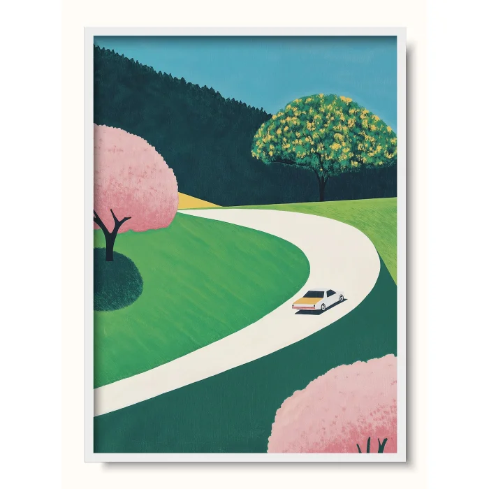 A white car driving on a winding road among pink and yellow trees in bloom.