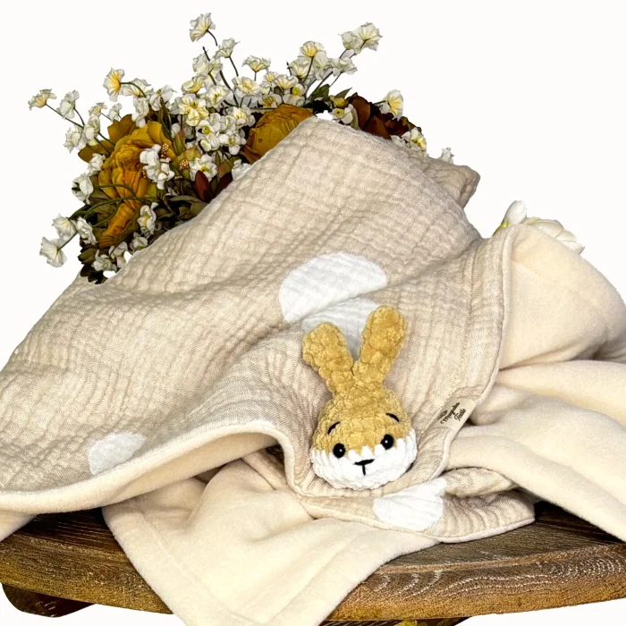 We are delighted to bring you this incredibly lightweight 4-ply blanket made of soft and breathable muslin and fleece fabric.