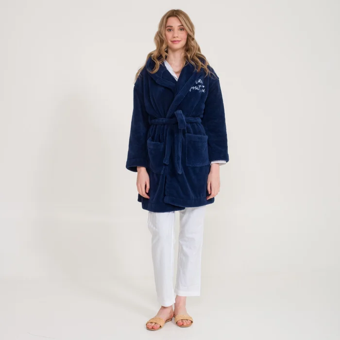 The motto embroidered over-the-knee fleece dressing gown provides a good start to the day.
