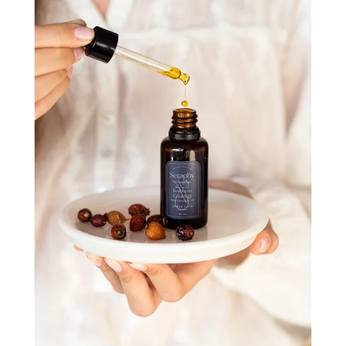 Rosehip seed oil, which contains natural retinol, (retinoid) Omega 3 vitamins A, C, E, is a fixed oil that is also golden in terms of vitamin C. It is good for brown spots on the skin. Due to the vitamin A and retinoids it contains, it reduces hyperopination on the skin. It helps to heal spots and redness caused by the sun. While it contains high amounts of vitamins A, C, E, it contains Omega 6 and Omega 3 fatty acids. It increases the cell cycle. It provides less acne, skin tone equalization and radiance on the skin. It increases collagen production, offering firmer and stronger skin. It increases the elasticity of the skin. With regular use, it also helps to form a moisture wall on the skin and eliminate problems caused by dryness. It is especially preferred against sun, pregnancy and age spots.
