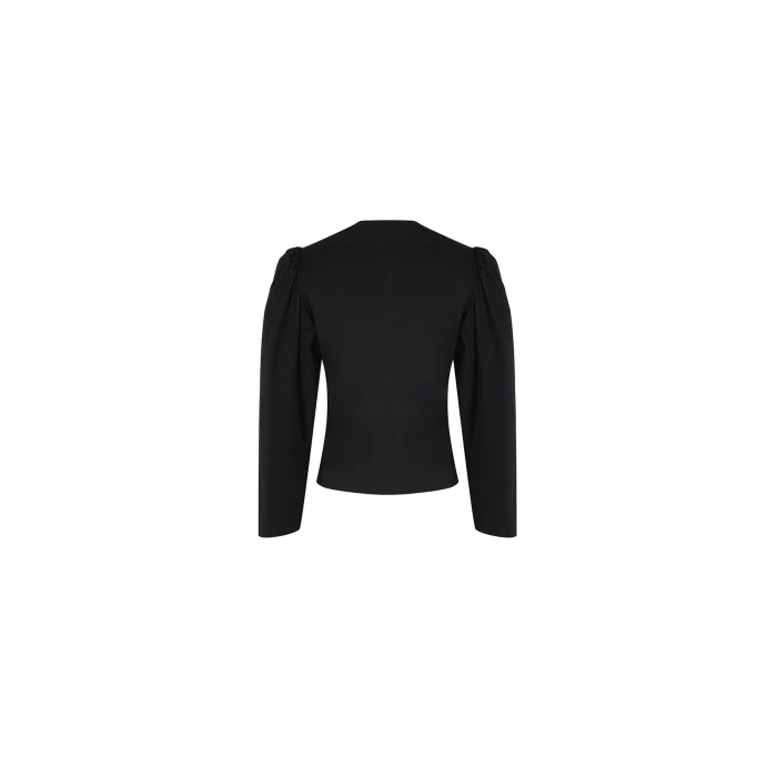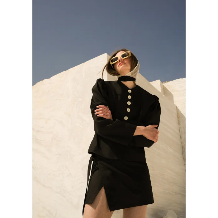 • Black Buttoned Front Padded Drawstring Jacket; It offers a nostalgic yet strong silhouette with its padded shoulders and gathered sleeves.