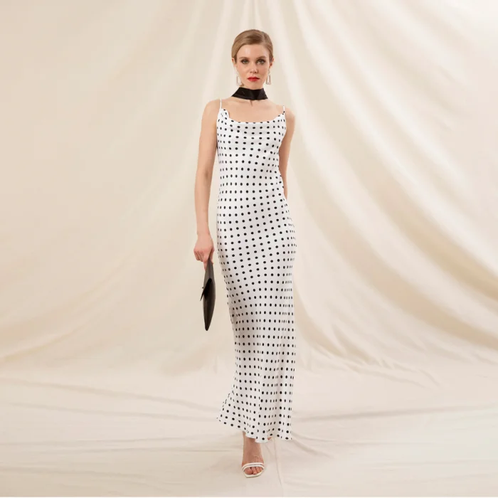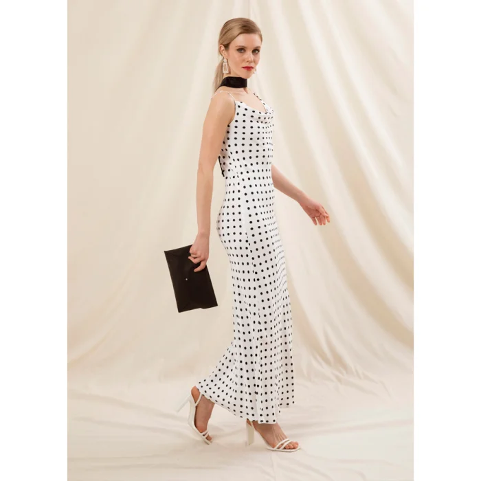 Cowl neck, spagetti strapped, ankle lenght Satine Dress, pops out of an envelope Pu leather clutch.