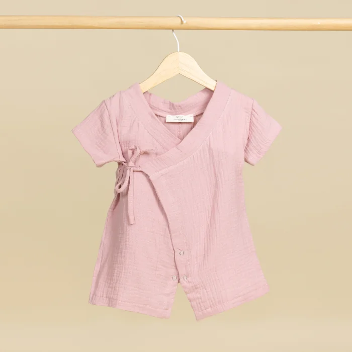 The naturalness of muslin fabric makes it a healthy option for babies. Made of cotton, this jumpsuit is designed not to harm your baby's sensitive skin. Thanks to its breathable fabric, it provides coolness in the summer months and has a structure that can be used comfortably in all seasons. This jumpsuit fits your baby's delicate skin perfectly with its soft texture. Muslin short-sleeved kimono baby romper attracts attention with its simplicity and elegance. These overalls, which have recently become popular under the name kimono among baby jumpsuit models, are available in powder pink, blue, white, camel and pink colors.
