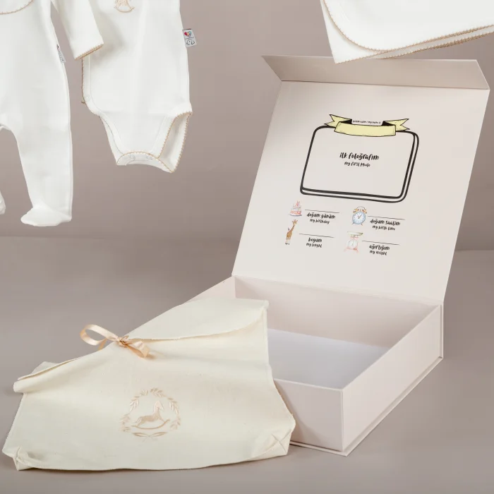 newborn sets produced in cooperation with MayysBaby and Chimommy; It comes with recyclable, environmentally friendly and 100% cotton raw cloth pouches, decorated with embroidery details suitable for our set. You can use our multi-purpose pouches as organizers in your hospital bag and baby care bag.