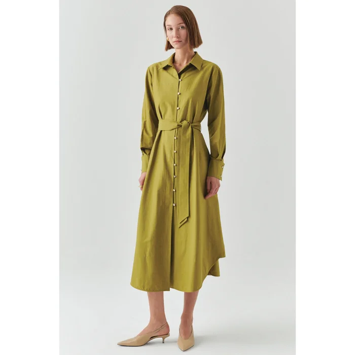 This midi-length dress, which adapts to the body with its belted waist design, offers both a classic and modern style with its shirt collar and front buttoned form. Thanks to its long sleeve structure, it can be used easily during seasonal transitions. Ideal for daily elegance or office combinations, this model easily matches with different accessories.