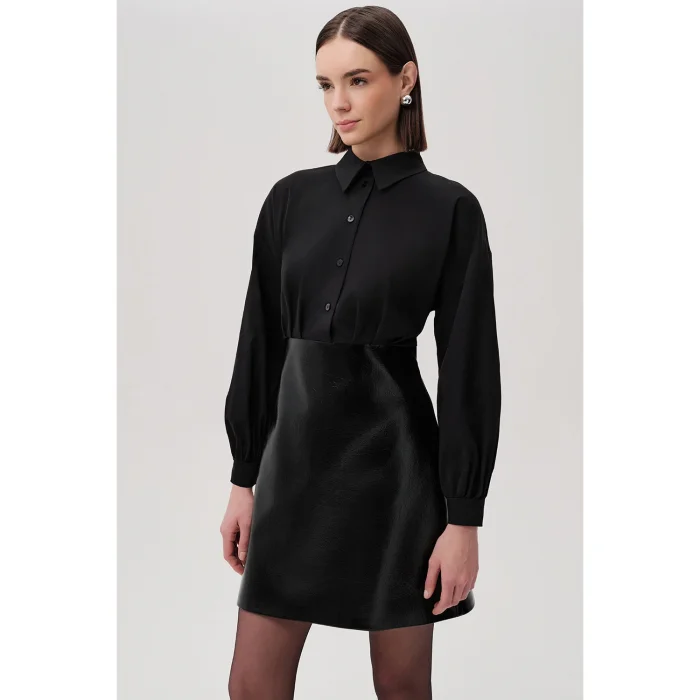Offering a classic and stylish look with its shirt collar detail, this mini dress creates a modern and dynamic style by perfectly hugging the body lines thanks to its slim fit pattern. The woven fabric construction offers durability and comfort, while the medium-thickness texture suitable for the winter season keeps warm; The button-down closure shape allows for practical use, while the linerless design adds lightness and breathability.; Offering timeless elegance with its black color, the dress provides a flexible and comfortable experience thanks to its cotton, polyester and elastane blended material. Its beltless design allows you to easily create customizable combinations with different accessories, while its slim silhouette exudes a modern and elegant stance.