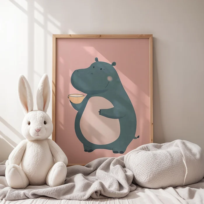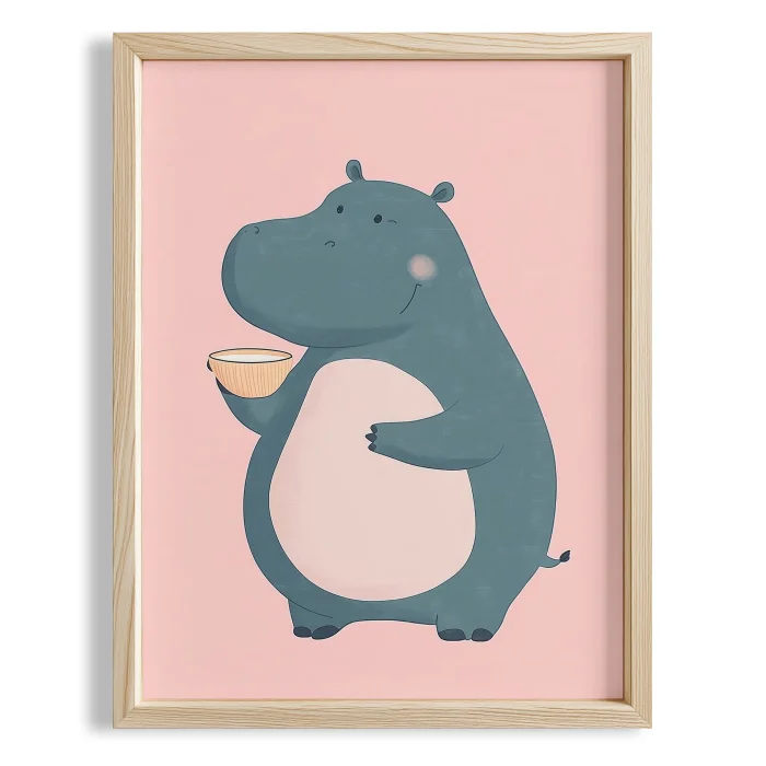 Product: Süt Seven Su Aygırı - Pink Background Children's Room Wooden Framed Wall Art
