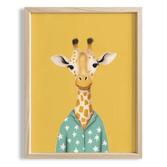 Product: Sleepy Giraffe In Pajamas - Yellow Background Natural Wood Framed Print