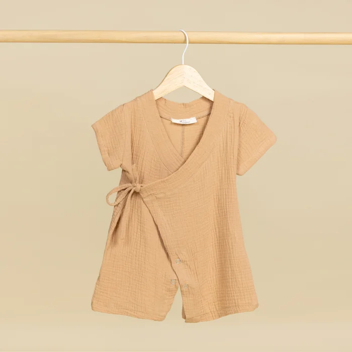 Muslin short-sleeved kimono baby romper is made of 100% organic cotton, with your baby's comfort and convenience in mind. Thanks to its natural and breathable muslin fabric, it provides a soft touch to your baby's skin and prevents sweating. Perfect for sensitive skin, this jumpsuit ensures your baby stays cool and comfortable all day long. Its lightweight structure is designed to keep your baby comfortable, especially on hot days.