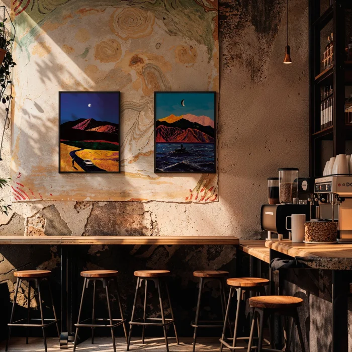 A person standing inside a small boat on a rough sea, colorful mountains and a crescent moon in the background.