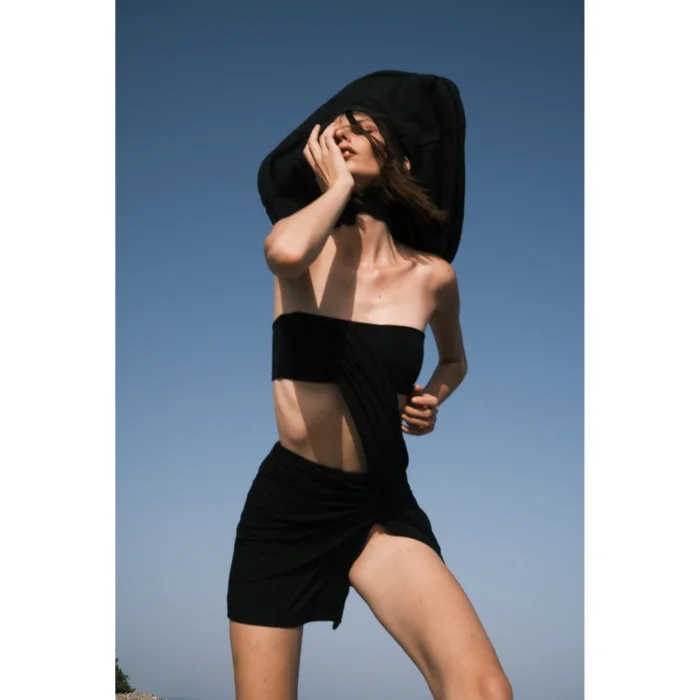 It elegantly ties the chest and underbelly with the same fabric, creating a Z detail. It is mini size. Inspired by the 90s. The model wears a size XS in the photo.