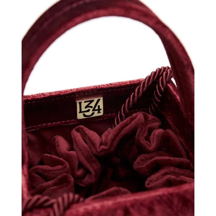 During the making process of this handcrafted bag, a patterned velvet is used. The lining and the pouch are made of velvet. The pouch inside the bag can be removed and used separately. The gold logo is placed on the inner side of the bag.