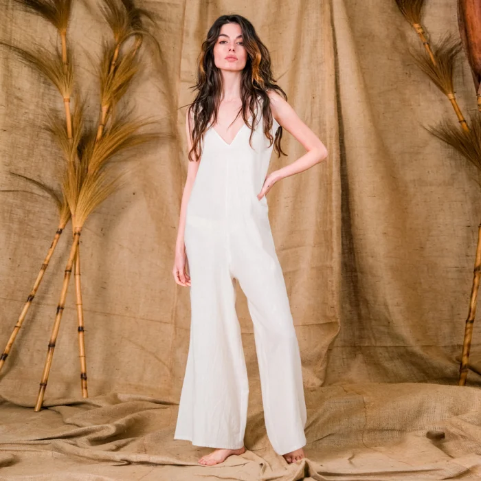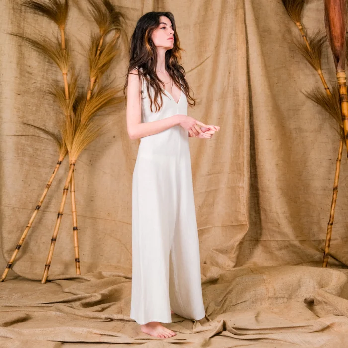 Eos, the tie shoulder cami jumpsuit. Made from Altar's signature handwoven cotton-linen, the relaxed fit jumpsuit with V front and back is a must have. The jumpsuit embodies a nomad's soul, where comfort and relaxation is priority. Wear it from day to night, there is no realm you cannot roam while wearing the Eos.