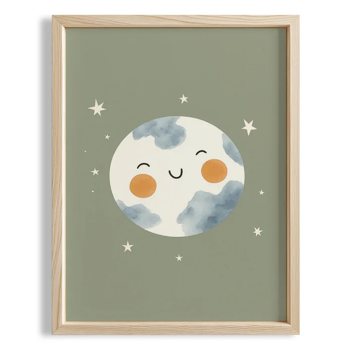 Cute Moon And Stars With Green Background Kids' Room Wooden Wall Art
