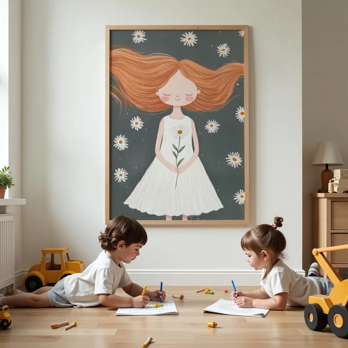 Product: Girl In Dress Holding Daisy Kids Room Wooden Wall Art