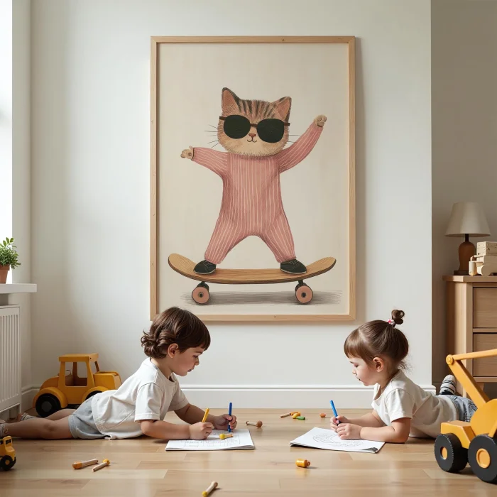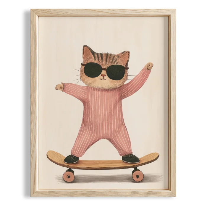 Product: In Pajamas Skateboarder Cat - White Background Children's Room Wooden Framed Wall Art