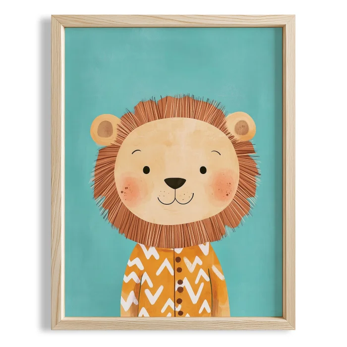Product: Sleepy Lion In Pajamas - Blue Background Natural Wood Framed Print