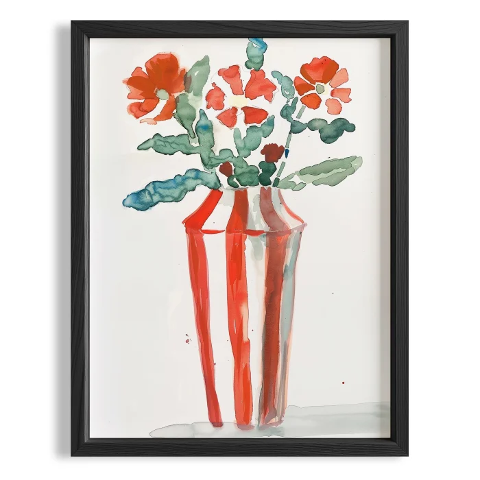 Product: Vazo Ve Çiçekler - Red Çizgi Suluboya Wooden Framed Wall Art