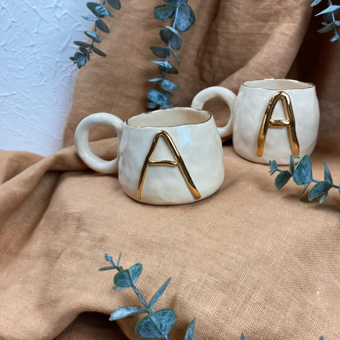 This specially designed stoneware ceramic cup is completely handcrafted and personalized with the letter "A" detail engraved with 24k gold on the surface. Each product is shaped in the hands of its artist and carries a unique spirit that distinguishes it from ordinary fabricated products.