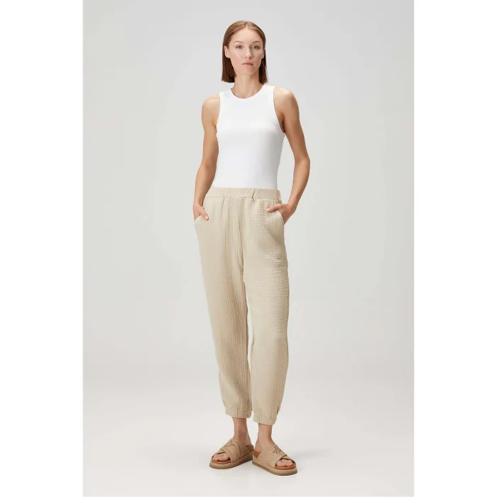 Cocoon Adult Pants are the most comfortable piece of loungewear with a natural 100% cotton texture; Its soft fabric hugs your skin, allowing you to make every move freely; Inspired by cotton cocoons, these trousers will take you to the pinnacle of comfort.; This product, which you can easily choose in daily life and resting moments, offers a simple and stylish style. It adapts to every body type with different size options and hugs you with pleasure throughout the summer.; Material: 100% Cotton; Model's Measurements: Height: 180, Chest: 79, Waist: 58, Hips: 88; The product on the mannequin is size S.
