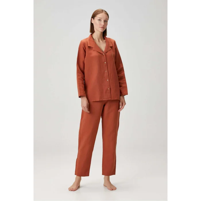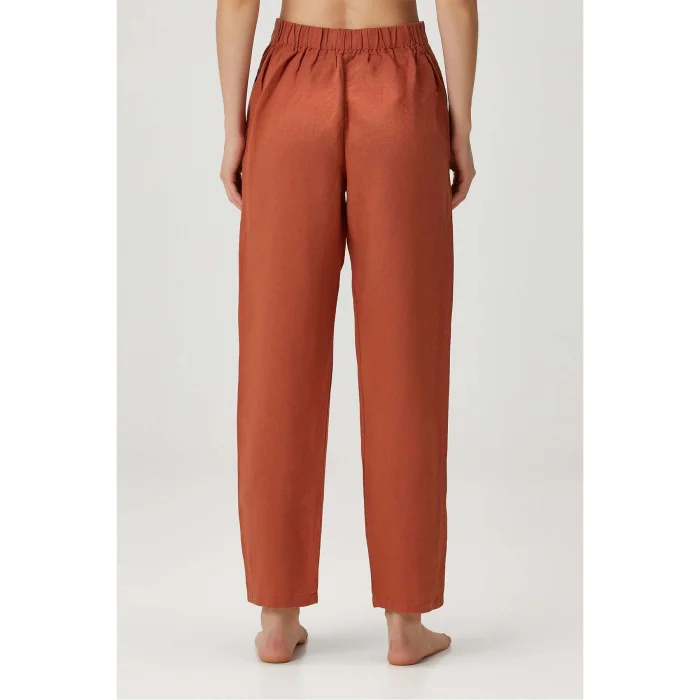 Lino Orange Trousers is one of the women's home wear designs that will be a hit in the new season with its spice color. ; The product is 65% Linen and 35% Cotton blended. ; Since the waist is elastic, you feel extremely comfortable in it. ; By completing the same color pajama top, you can use it with pleasure both in home wear and during sleep. ; SUSTAINABILITY Flax is a naturally sustainable and oldest known plant fiber. ; In addition to being antibacterial and hypoallergenic, its production requires much less water than other types of fiber and can be produced without the use of almost any chemicals. ; Linen is also an extremely durable fiber, which is effective in creating products that are durable and can be used for a long time. ; DESCRIPTION 65% Linen 35% Cotton Washed product for extra softness, sustainable product Oekotex certified CARE INSTRUCTION Machine wash at max 40 C. ; Do not use bleach. ; Dry in the dryer at low temperature. ; Iron at high temperature. ; Do not dry clean.;