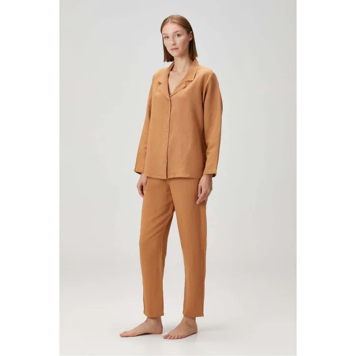 Orange Trousers is one of the women's home wear designs that will be a hit in the new season with its spice color. ; The product is 65% Linen and 35% Cotton blended. ; Since the waist is elastic, you feel extremely comfortable in it. ; By completing the same color pajama top, you can use it with pleasure both in home wear and during sleep. ; SUSTAINABILITY Flax is a naturally sustainable and oldest known plant fiber. ; In addition to being antibacterial and hypoallergenic, its production requires much less water than other types of fiber and can be produced without the use of almost any chemicals. ; Linen is also an extremely durable fiber, which is effective in creating products that are durable and can be used for a long time. ; DESCRIPTION 65% Linen 35% Cotton Washed product for extra softness, sustainable product Oekotex certified CARE INSTRUCTION Machine wash at max 40 C. ; Do not use bleach. ; Dry in the dryer at low temperature. ; Iron at high temperature. ; Do not dry clean.;