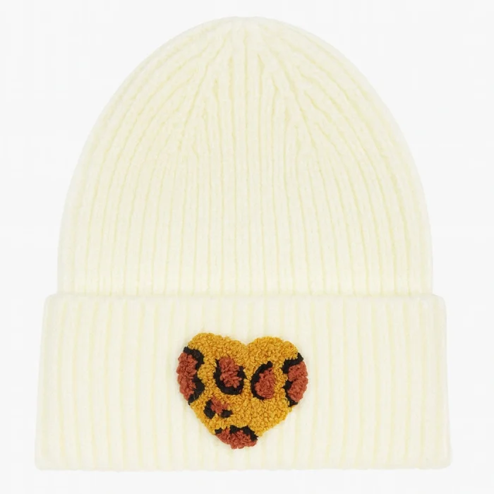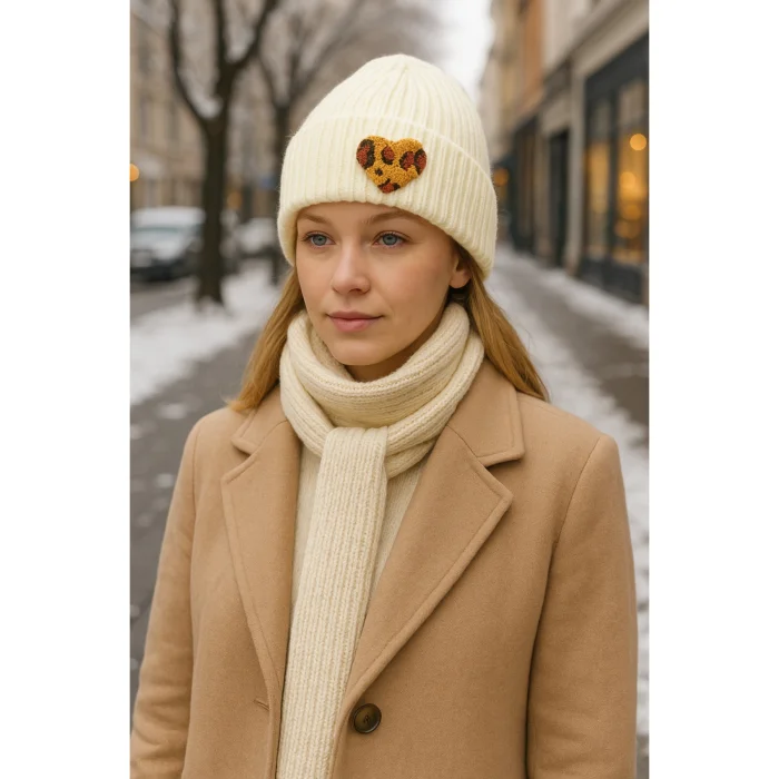 Product: Cream Beanie Brown Leopard Heart Punch-embroidery Detailed Gift Holiday/christmas