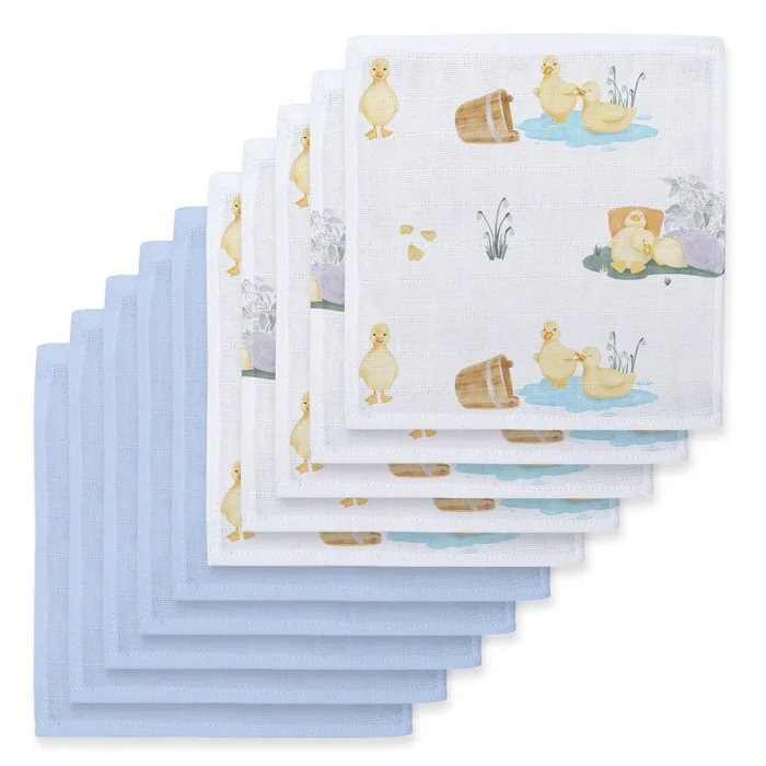 Life is now easier with our mouth cloths! You can use our life-saving 100% cotton muslin mouth cloths while feeding, breastfeeding or passing gas to your baby. You can easily carry it with you with its 10-packs. In this set, there are 5 Petits Canetons and 5 Cotton Grey muslin mouth cloths. Its dimensions are also 20 x 20 cm. Discoloration and shrinkage that may occur after use and washing are caused by the nature of the cotton fabric. After a few washes, the cottoning will be finished. Returns due to shrinkage and normal level of cotton are not accepted.  The use of bleach is strongly discouraged in our muslins due to our sensitive textures and dyes, and it is recommended to use stain remover products based on their own prospectuses. Made in Turkey.