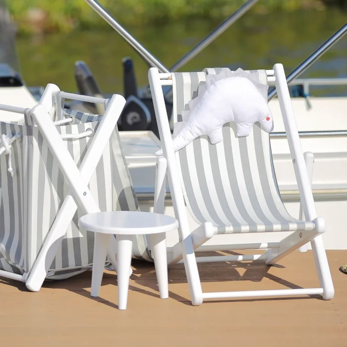 Two-stage solid wood fun children's resting seat. Includes a dino pillow and a pink-and-white striped cushion. You can use our children's chair in both ways, reclining back and upright in a seated position. Opens & Closes & Disassembles.