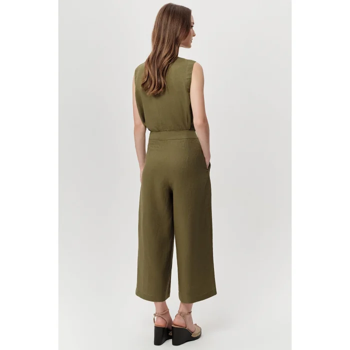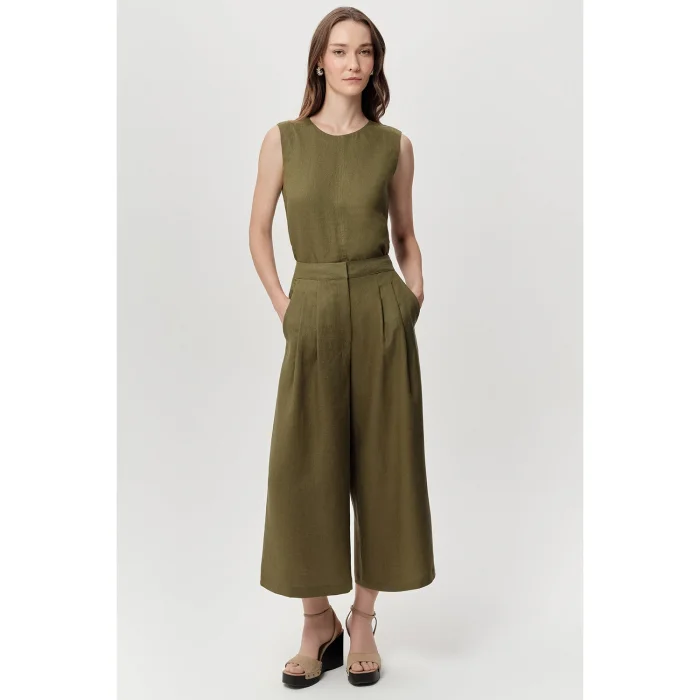 Zippered culotte trousers with pockets will be a modern addition to your wardrobe. While the khaki color offers a stylish look, it combines both comfort and up-to-date style with its regular fit and culotte cut. Thanks to its natural fabric texture and functional details, it makes you feel good all day long. Culotte trousers offer freedom of movement thanks to their wide-leg structure and provide a suitable cut for many body types. Its high-waisted design creates a stylish stance by emphasizing body lines. Its zippered closure offers practical and secure use, while its pockets allow you to easily carry your personal belongings such as phones and keys. While linen fabric helps you stay cool even in hot weather with its breathability feature, it is an ideal choice for those who do not want to compromise on a stylish appearance. When combined with a basic t-shirt or a stylish blouse, these trousers can be easily preferred both for daily use and on special occasions. Culotte trousers in this khaki color are a versatile piece that can take their place in wardrobes in all seasons. With its linen fabric and soft texture, it offers both a stylish and comfortable experience. Its zippered design and functional pockets increase its usefulness, while its regular fit offers comfortable use. These trousers have a wide range of uses, from street fashion to office elegance. While you can create a comfortable combination with sneakers and a basic top in daily life, you can also achieve a more classic look with high heels and a stylish shirt. The naturalness of the khaki color and the modernity of the culotte cut will make these trousers a key part of your stylish and modern combinations. Product Details: - Cut: Regular - Leg Type: Culotte - Waist Type: High Waist - Closure: Zippered - Pocket Detail: Available