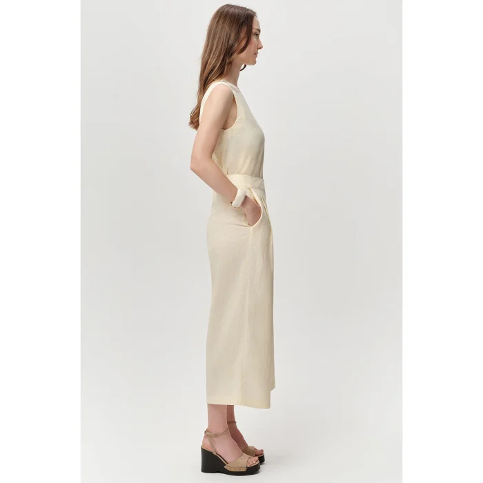 Pocket Zippered Culotte Regular Linen Butter Trousers are a stylish and useful piece that combines your modern style with comfort. These culotte pants will add a nice touch to your wardrobe with their "butter" color, making them a versatile option that can adapt to many different occasions. Its wide-leg cut and elegant drape allow you to move comfortably all day long and offer a stylish look. It is designed to complement your style both in daily use and in more special moments. This women's trouser model highlights the natural texture and breathable structure of linen. Linen fabric, which keeps you cool and comfortable, especially in hot weather, is one of the reasons why these trousers are preferred. The zippered pocket allows you to carry your small items with confidence, adding functionality to the overall design of the pants. Its regular fit fit and ankle-length cropped length create an up-to-date and modern silhouette. Pocket Zippered Culotte Regular Linen Butter Trousers offer versatile combination possibilities. Thanks to its simple design, it can be easily combined with basic t-shirts, stylish blouses or elegant shirts. With the choice of accessories, it can take on a sporty look or a more classic style. Whether it's a stroll around town, a lunch, or a more formal occasion, these pants provide you with a stylish presence. With these wide-leg trousers, you can enjoy being both comfortable and stylish. For those who embrace a minimalist and modern fashion approach, these trousers are a stylish and functional choice. Its ability to easily match with different tops and shoes will make it one of the key pieces in your wardrobe. It is a suitable option for those who are looking for linen trousers and want to experience comfort without sacrificing elegance. You can add an elegant atmosphere to your combinations with these modern trousers. Product Details: - Fabric: Linen - Color: Light Beige - Cut: Regular Fit, Culotte (Wide Leg, Ankle Top) - Features: Zippered Pocket